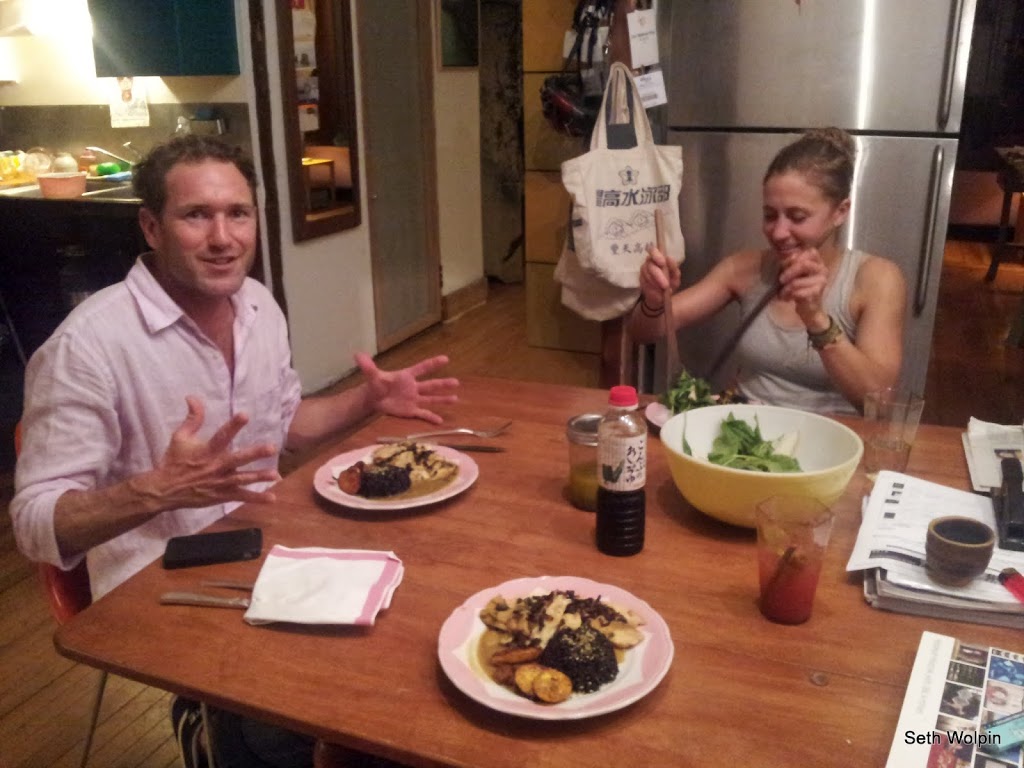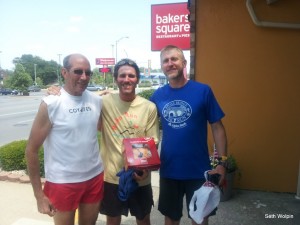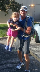 Struggling a bit with whether any of this mattered, I realized that it gave me the opportunity to try running with a backpack like James Shapiro. I’ve used a 33 liter Osprey Talon backpack to hold the majority of my gear from the start. This pack sits in the main compartment of the jogger, the same place a child would sit. It’s a pack that I have used in Seattle for literally running errands and I also used it to fast pack the Annapurna Circuit in 2011 with buddies Rich White and Scott Railton. It’s also been partway up Everest. In short, I love the pack and think everyone should have one (I have no connection with the company).  So I ditched the jogger and filled the pack with the bare minimum and I ran for two days with it bouncing on my shoulders a bit. It felt dumb running with gear I knew I wouldn’t need that night but I wanted to be sure that it would be a good switch and I also felt that it fulfilled the spirit of being unsupported since I could theoretically get by with the stuff on my back if all hell broke loose. The freedom was amazing. We ran on terrible roads filled with suburban highways where the shoulders were nonexistent or covered with shattered glass. With my pack I could go everywhere and over anything. By the end of the second day my shoulders were completely tenderized but I was smiling. If James Shapiro could do it, so could I. After reaching the state line with Indiana, accompanied by Larry Swanson and Craig Haynee, my cousin Margot and her friend Spike helped me ship the jogger and 40 pounds of asocciated gear to my aunt Mimi in Ohio. I should be there in 12 days – enough time to test the backpack idea. Thank you Spike for an amazing Sushi dinner! I’m sorry I don’t have a picture with the three of us.