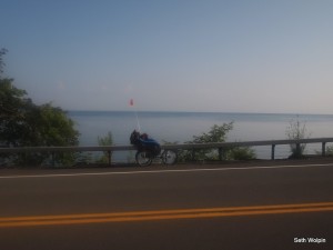 It felt great to cross into Pennsylvania – and with only 45 odd miles it went by fast. My route, calculated largely by google, coincidentally took me close to the doorsteps of my cousin Jean and husband Milt’s house on Lake Erie. Unfortunately they were in Budapest but offered me the house via email. I’ve learned not to say no to anything on this trip and after 37 miles with crazy heat and humidity it was really appreciated. Sitting directly on the lake with 30 foot vaulted ceilings, private beach front, cattery with a heated floor, and a whole wall of windows looking out at the lake. It was a great place to unwind. I fell asleep to the fourth of July fireworks from Erie. Much thanks Jean and Milt and also a lot of thanks to the caretaker Dan who totally helped me out while still in damage control mode after windstorms had thrown limbs across the road and knocked out the power for 15 hours.