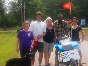 I actually had a bit of a cheering squad during the run as my Mom and Rafael back tracked on their journey for a bit so that we could all have lunch at Harold and his wife Barbara’s cottage. Barbara has run five marathons and we ran the final stretch to the cottage together. I also got to meet my second cousins Laura and William which was pretty cool. I spent most of the afternoon on their deck doing route planning and catching up on some work email. Laura helped me re-do the sign on the front of my jogger which had looked like an art school failure for too long. The new version will show up in future photos, I’m already getting a lot more honks and fist pumps from passing drivers – I have to say those boost my spirits.