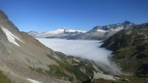 Clouds spilling over Cascade Pass. Eldorado Peak in the distance with knife ridge.
