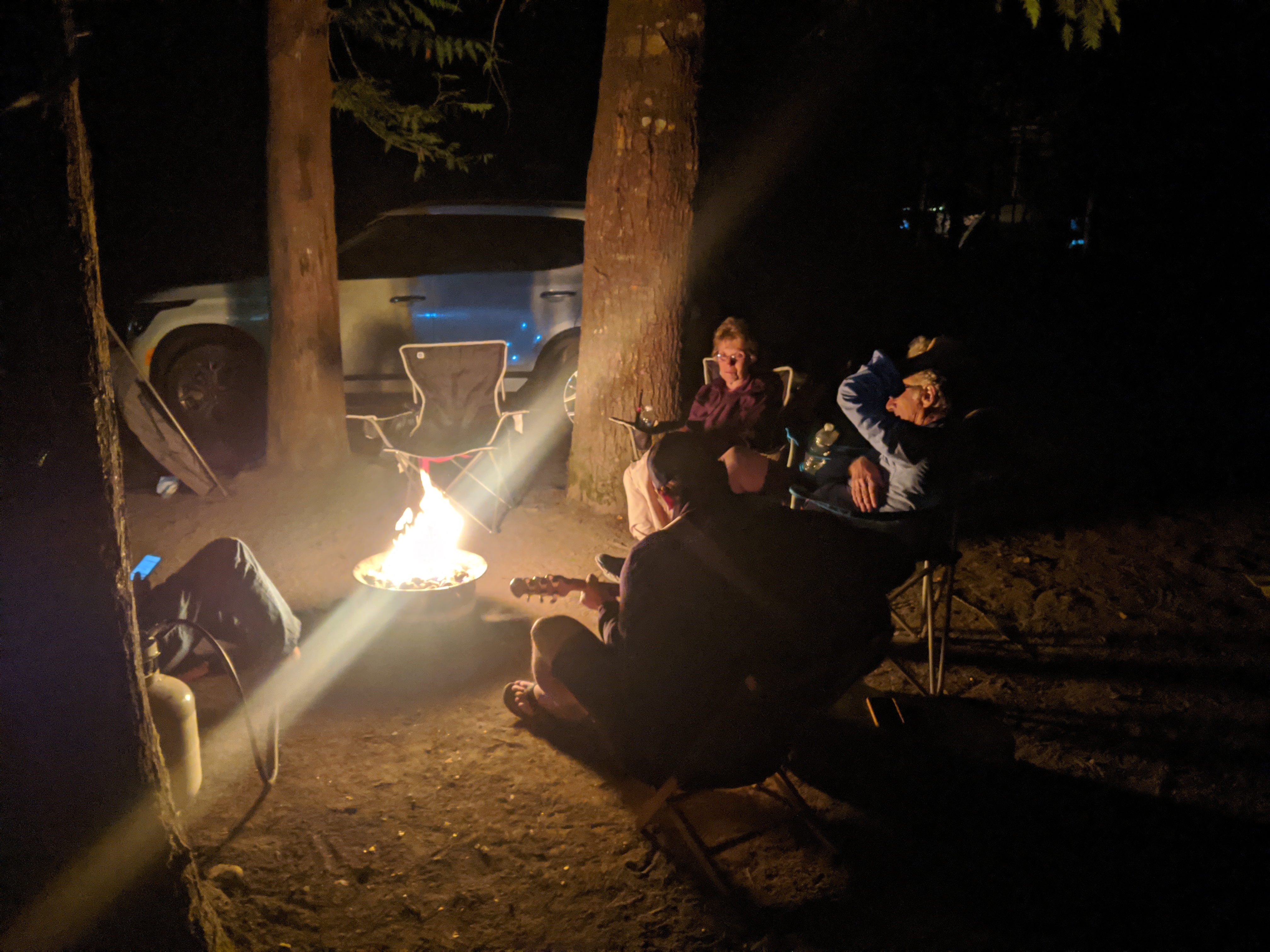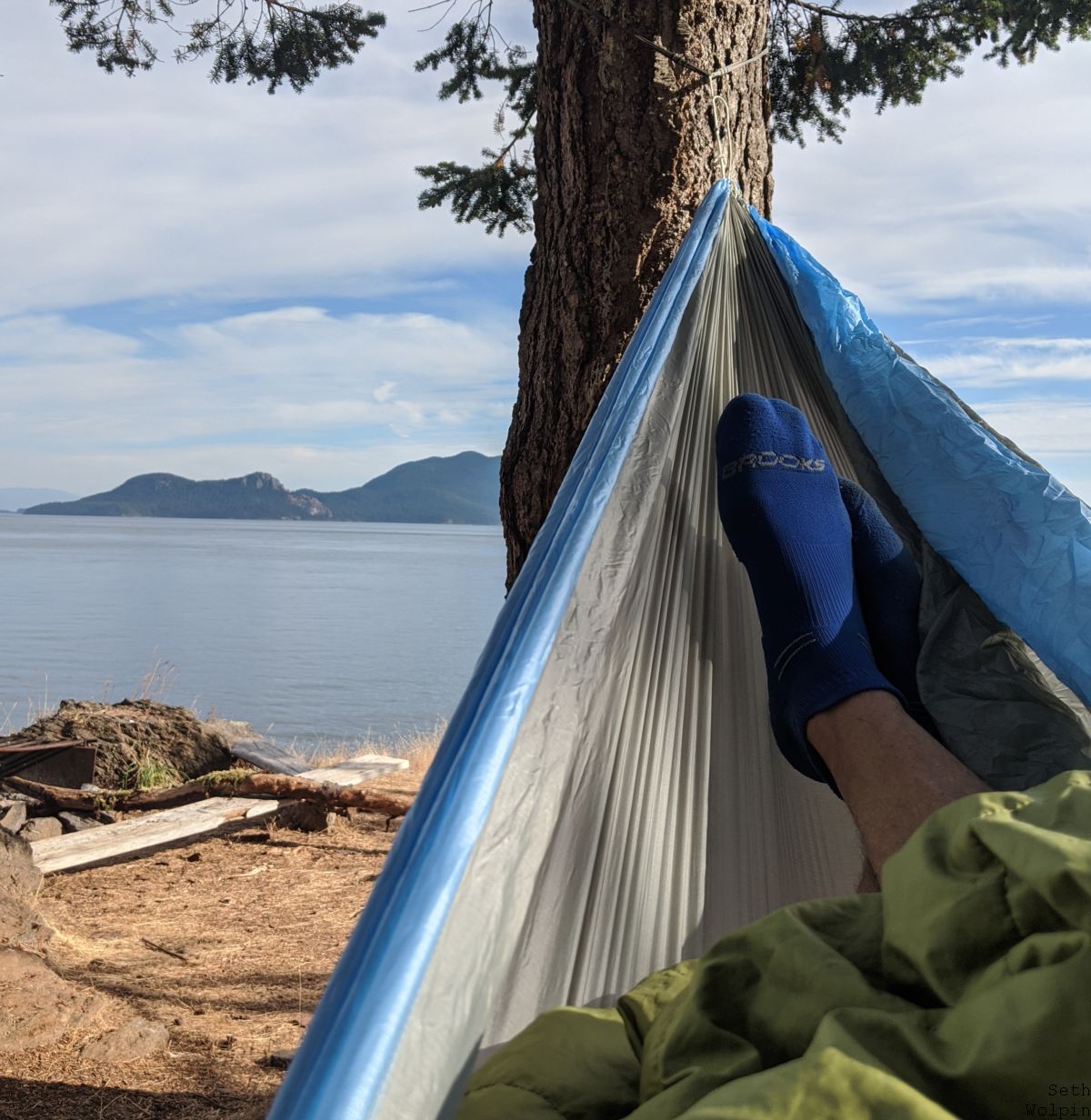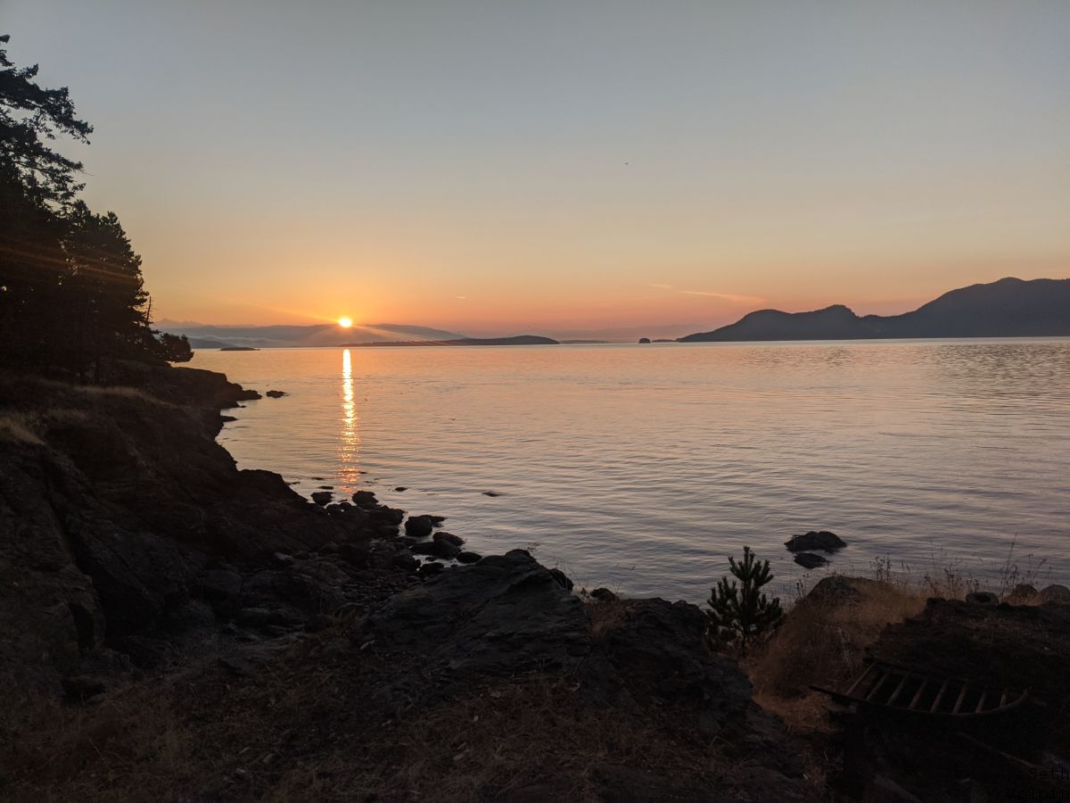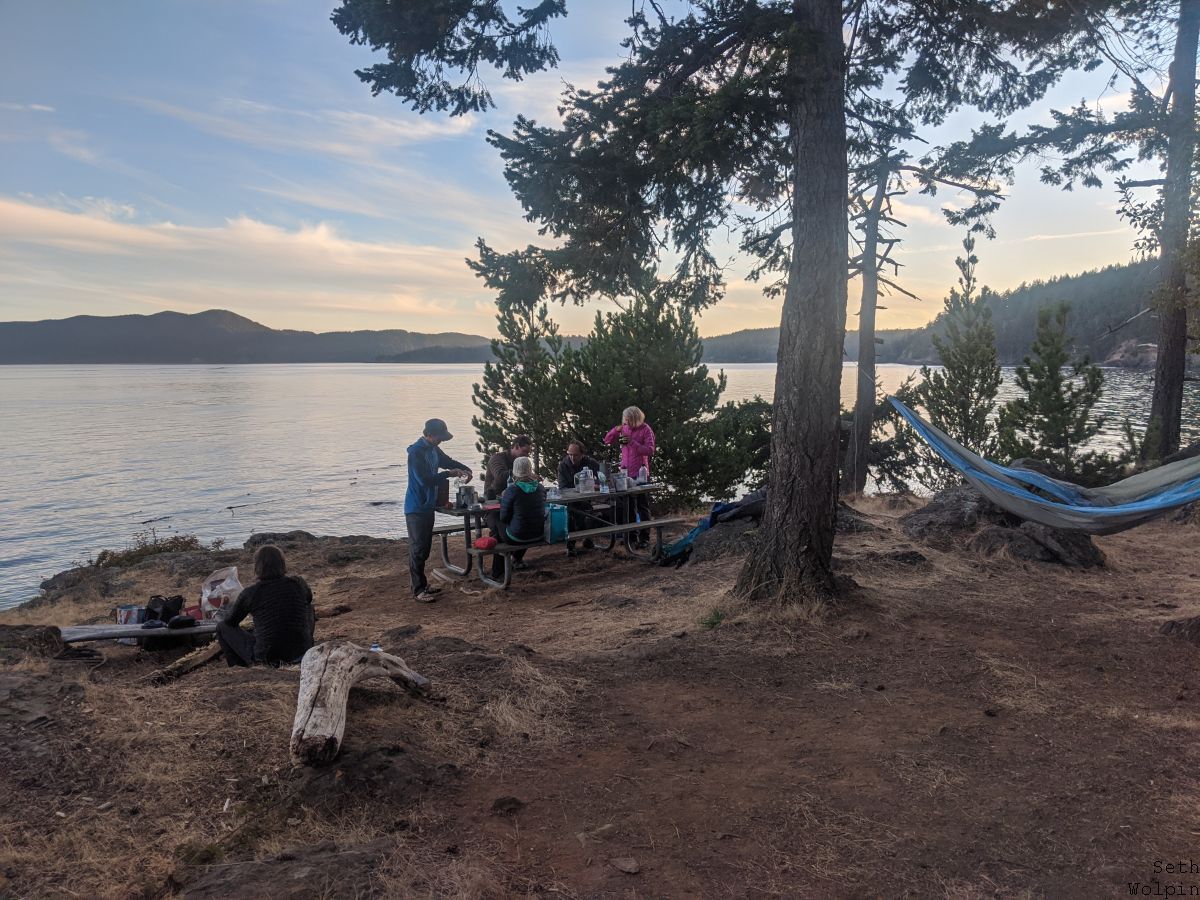 I took the southern-most site and spent a couple hours reading and dozing in my hammock before everyone sat down to eat dinner together. While swinging back and forth, I finished the book ‘The Sun is Compass‘ (non-affiliate link to independent bookshop) about a couple who paddled and trekked ~4,000 miles from near this area to Alaska. I highly recommend the book , especially for bird lovers as the writer, Caroline Van Hemert, is an ornithologist.. Reading about their epic journey, along with this relatively brief experience in the Salish Sea has kindled some dreams. Sadly no sunset as we were facing east, but still a beautiful night with some good company.