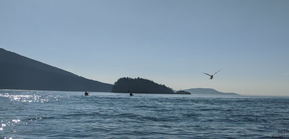 The ferry ride went quick and with a little more fussing near the landing on Orcas Island, we had our boats in the water and we were off to the races. Benj had lent me a pretty fast fiberglass kayak – this was almost ten feet longer than the little river kayak I keep on my sailboat for getting to shore. It had lots of room for carrying gear, and foot pegs attached to a rudder that could be dropped down. I decided to try paddling without the rudder and found that with a little effort I could keep a relatively straight line and almost keep up. I still have some work to do with my technique, or possibly I am just lazy – for most of the trip I was a laggard but never by too much (or else the group was simply being kind and slowing down occasionally so I could catch up). Overall, we were lucky, conditions were really calm and without much effort we were covering ground at 3-4mph headed toward Spencer Spit on Lopez Island. The area was not new to me – but seeing it from a sea-kayak and moving through it largely under human power was new.