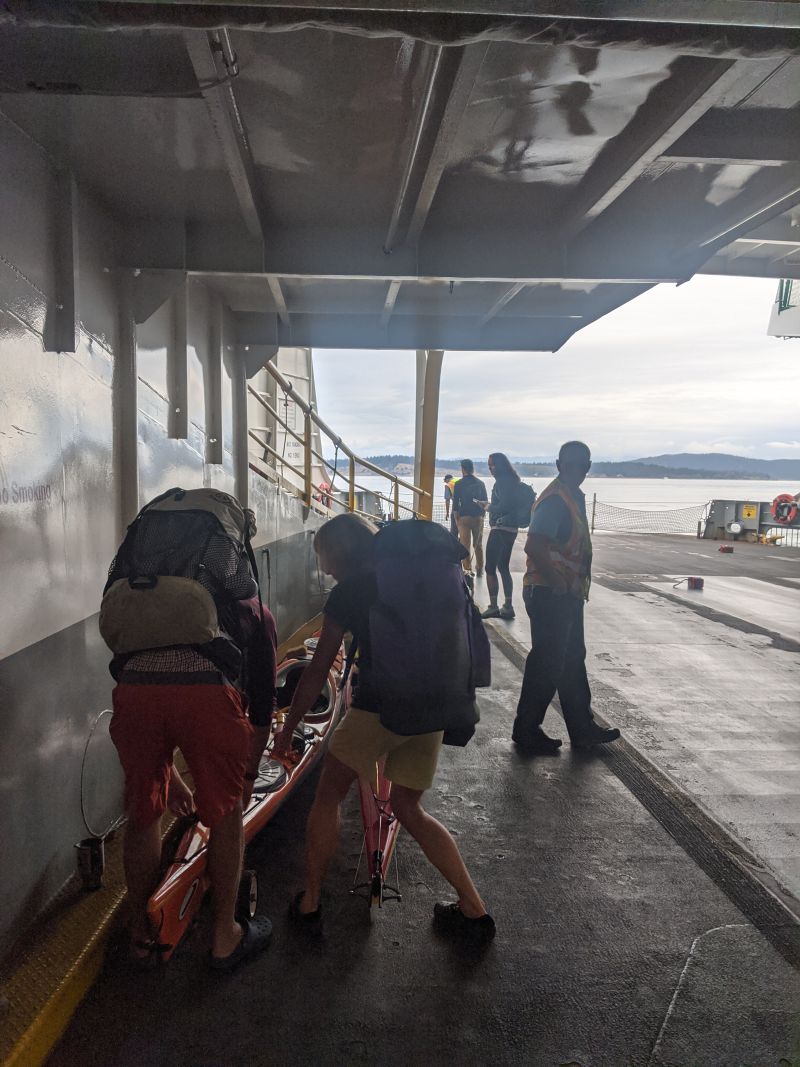 We decided to get a jump on things by taking our kayaks on the ferry to Orcas Island from the terminal just west of Anacortes on Fidalgo Island – the goal included a safety step, allowing us to skip a potentially rough crossing of Rosario Strait – a tough body of water encompassing shipping lanes that route some pretty large commercial boats north to Canada and Alaska. We met Megan and Ross, two of Kimberly and Ben’s friends at the ferry terminal and started sorting gear out – thankful that the ferry was running a little behind schedule. Getting our kayaks on to the ferries required a little finesse, greatly aided by a having some small wheels to strap under each kayak.