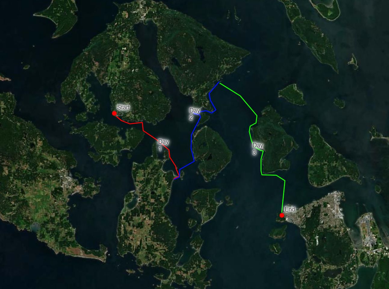 So when my friends Kimberly and Benj invited me a couple weeks later to go on a multi-day sea kayaking trip with them I did not hesitate. Both are experienced ‘outdoor folks’, versed in adventure races, kayaking, pack-rafting, and back-country skiing to name a few. Kimberly has also been working through a full sailing curriculum and developing skills in marine chart reading and navigation techniques. They had an extra kayak to lend and had already studied the tides, currents, and wind conditions and plotted a route. And the start would be near my home town of Anacortes, WA. In other words, all the hard work was done and all I really had to do was show up. As Kramer would say, ‘Giddy Up!’