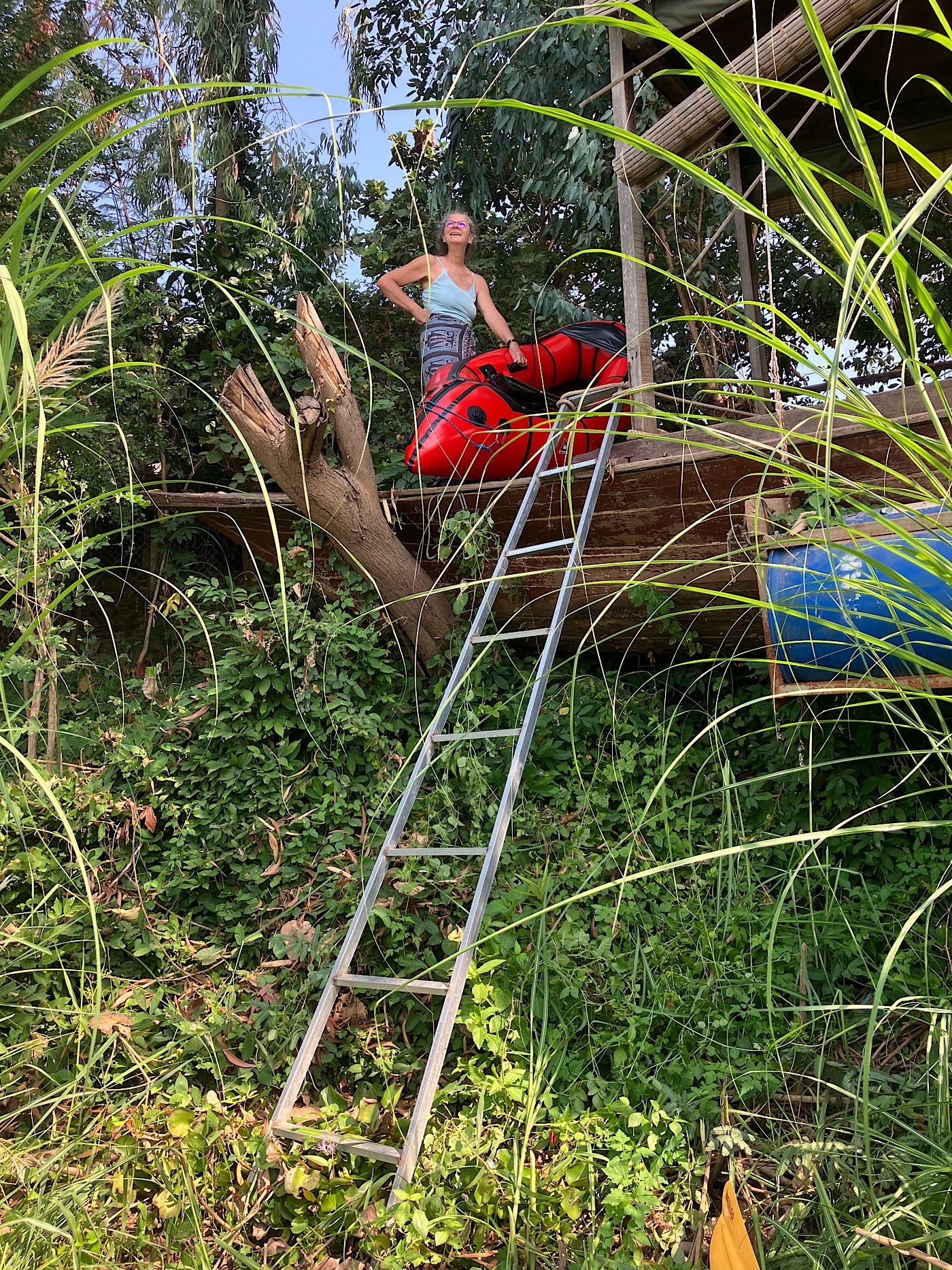 Frances and I had been trading texts, so she was there to welcome me  – standing on their old boat and lending a hand to help me get my boat up the river bank and into their back yard.